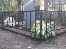 Так выглядит окончательный вариант места захоронения. По факту на этом участке мы переустановили памятники, восстановив одно из надгробий, покрасили оградку, замостили внутреннюю территорию брусчаткой и поставили лавочку со столиком. После окончания работ надписи на памятниках были дополнительно обработаны акриловой краской, это защитит их от пропадания в дождь и от пятен пыльцы растений и грязи.