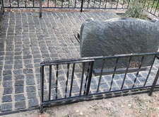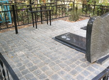 Переходим к завершающему этапу работы. Переустанавливаем уже стоящий памятник, немного его приподнимая, и закладываем территорию участка гранитной брусчаткой.